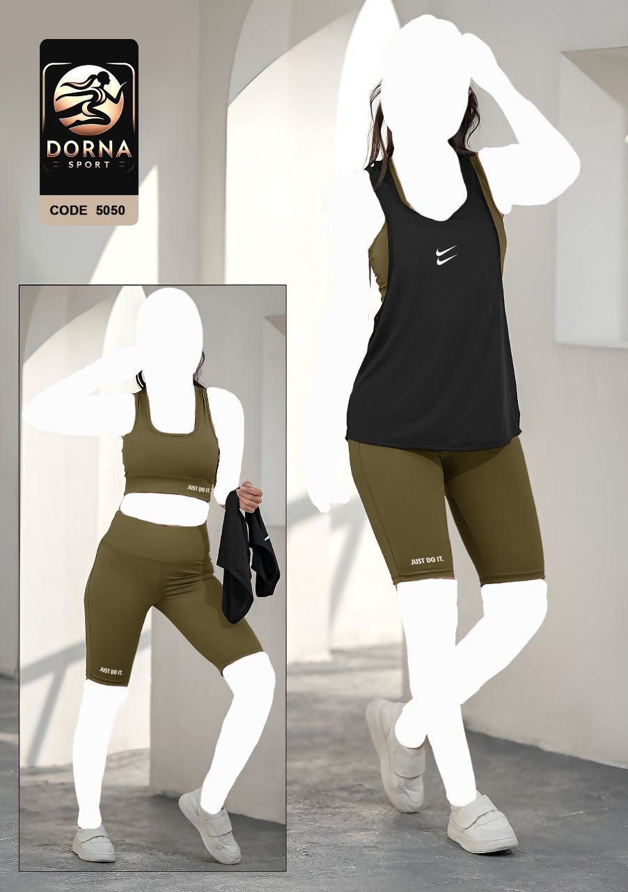 ( تک عددی ) ست نیمتنه شلوارک و کاور ورزشی زنانه زیتونی کد 5050